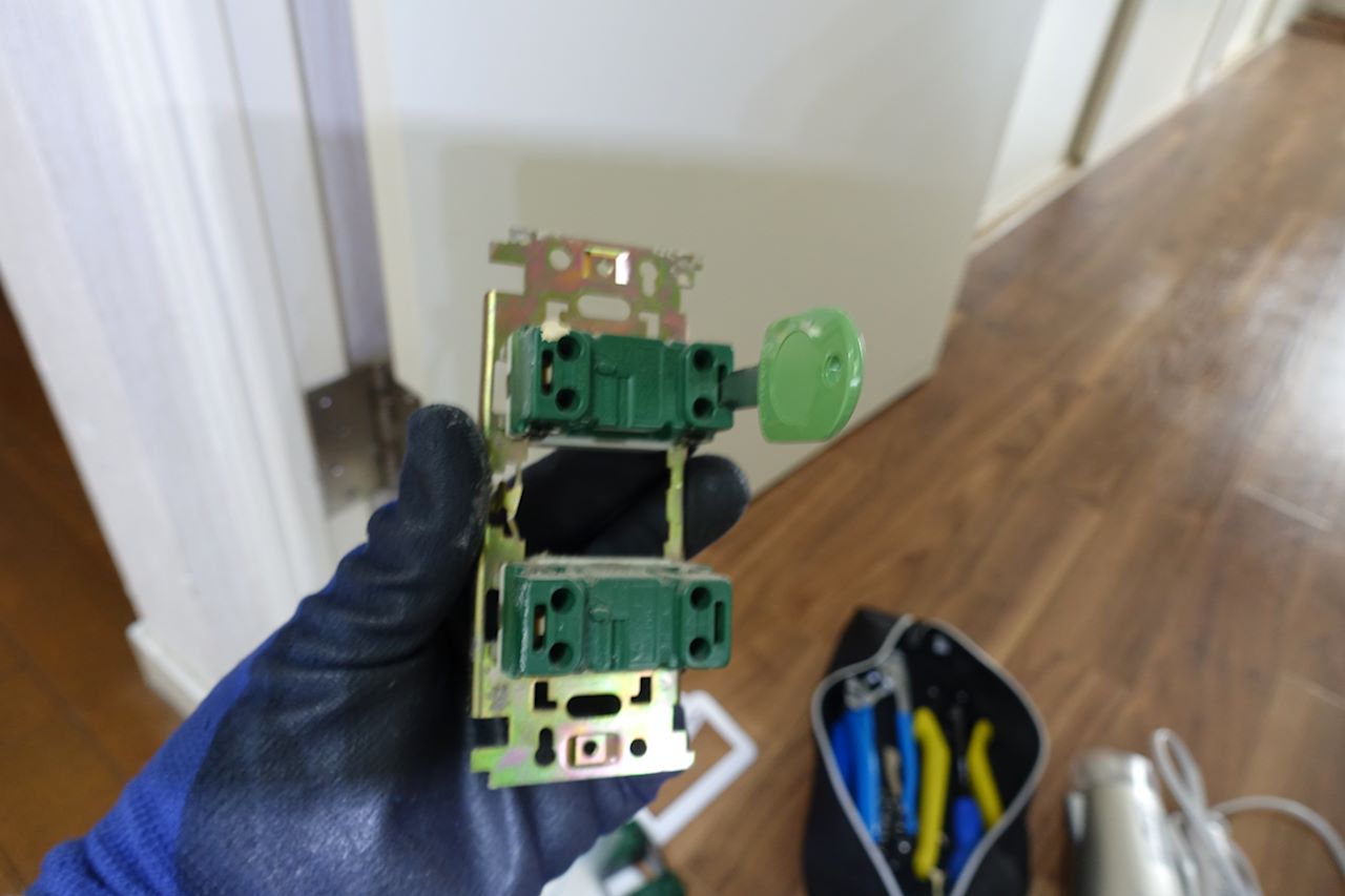 古い方の電線は、パナソニックの『プレートはずし器』という道具を穴に差し込み引き抜きました。マイナスドライバーを差し込んでもいいのですが、私は握力が弱く、練習の時からレンタル用具に付いていたプレート外しが一番うまく線が抜けたので、試験本番前に購入したんです。今回もするりと抜けました。