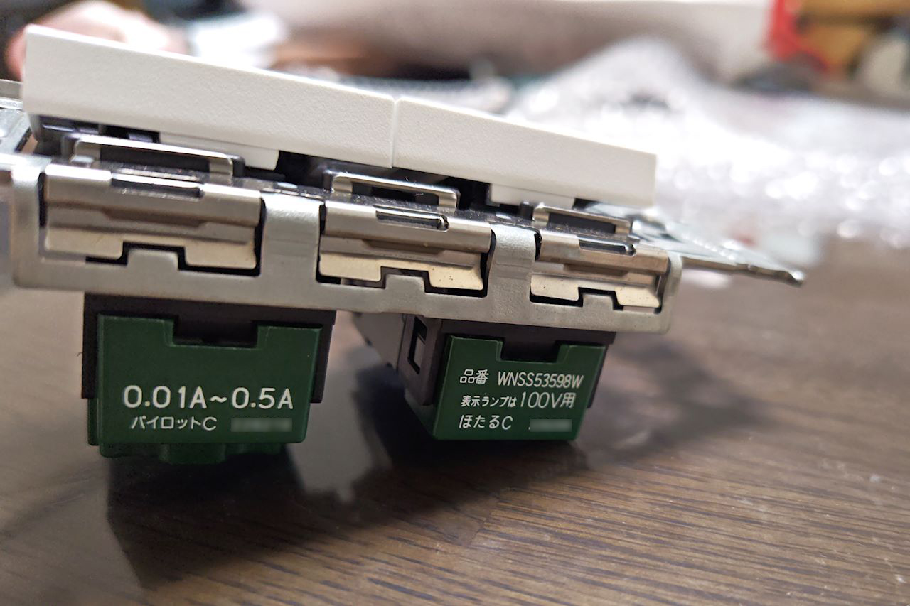 今回たまたま、上のスイッチがホタル、下のスイッチがパイロットランプという組み合わせ。これ、結構ニッチな商品だと思うんですけど。例えば、浴室のスイッチと換気扇の組み合わせとか?