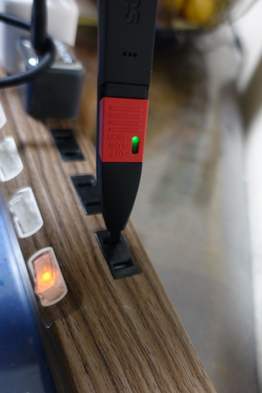 試しにテーブルタップのコンセントの、接地側(N側)に差し込むと、緑のランプが光ってるだけで変化がありません(この反応が正常)。