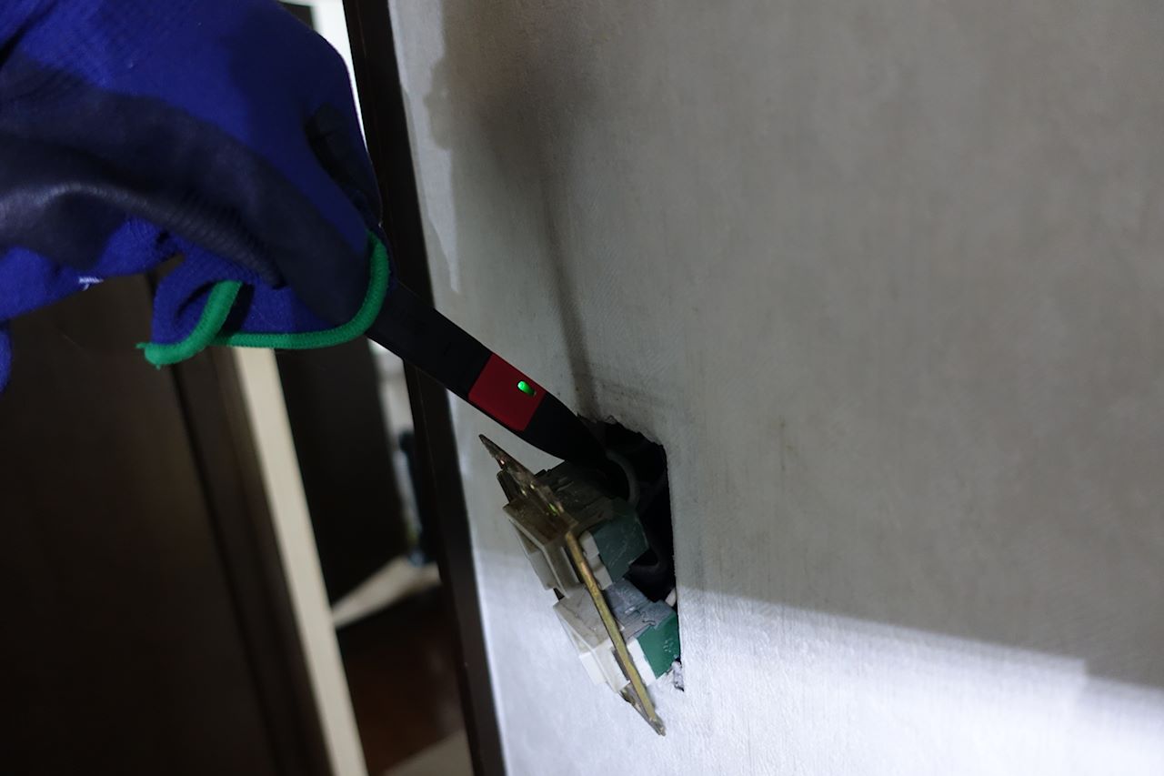 ネジを外して、スイッチを引き出します。念のために、検電器で電気が来ていないか調べます。警告音もならず、電気は切れている模様。