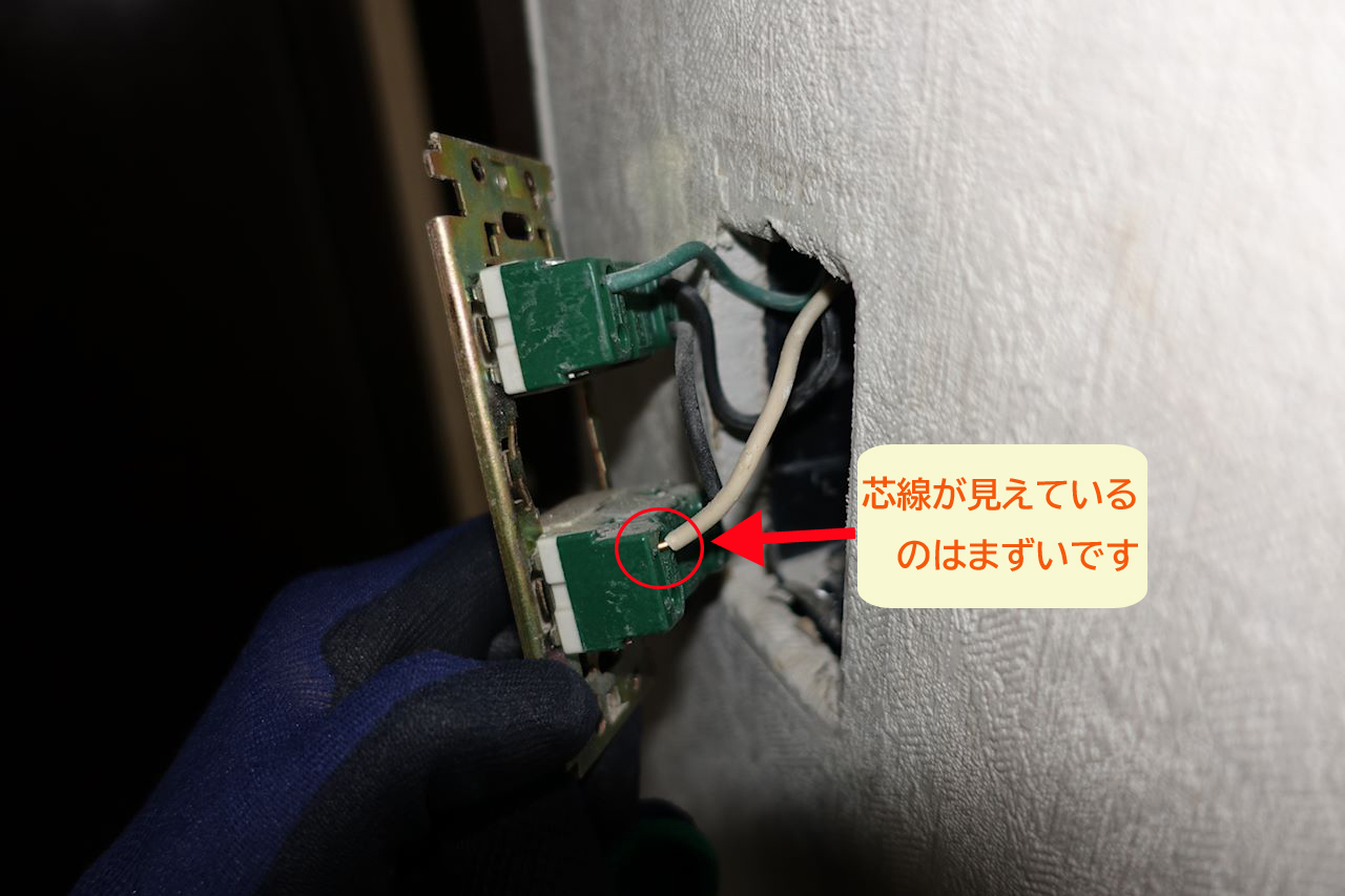 試験勉強の時、欠格事項として、『スイッチの芯線が見えている』がありました。本来でしたら、これはNG!でも、現場あるあるなのかなぁ・・・