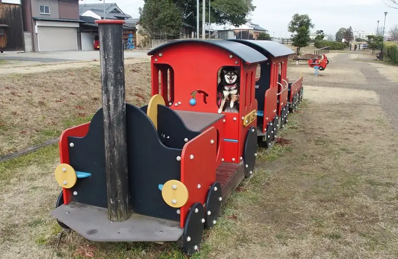 はせがわ展望公園内の汽車ぽっぽの遊具は、あずきもお気に入り。