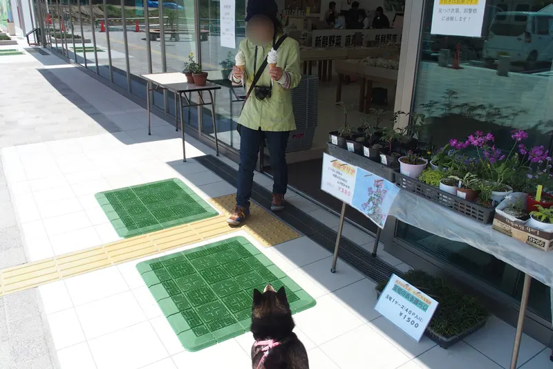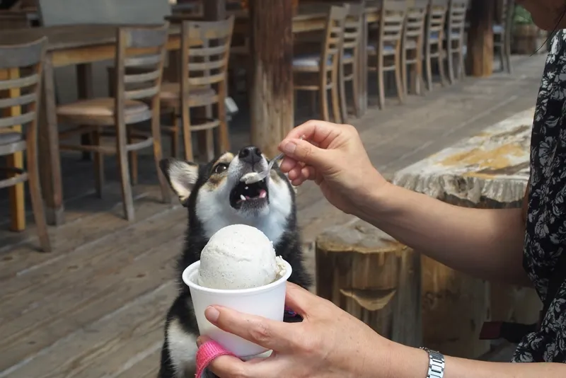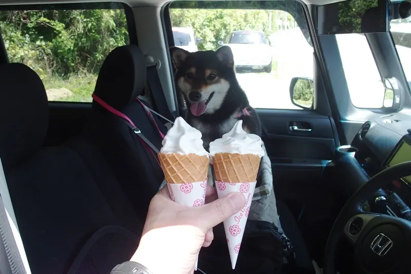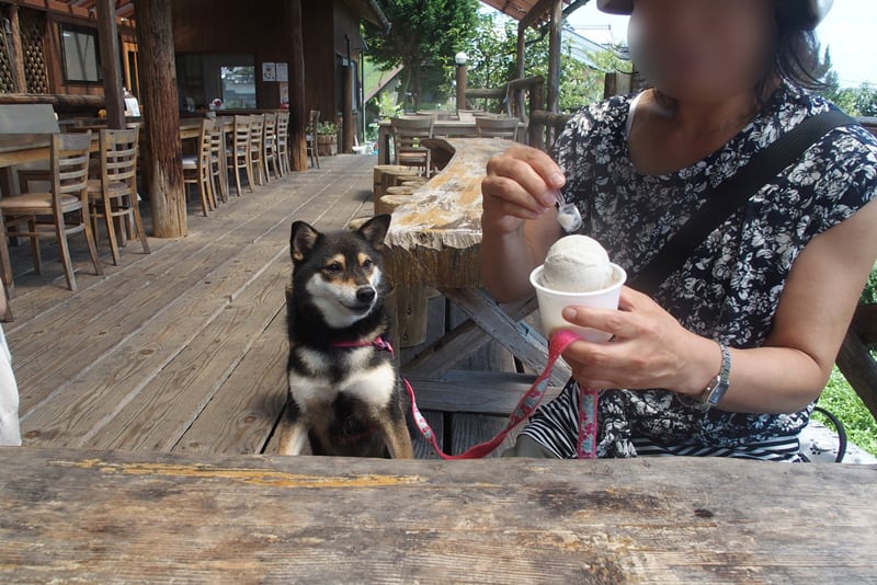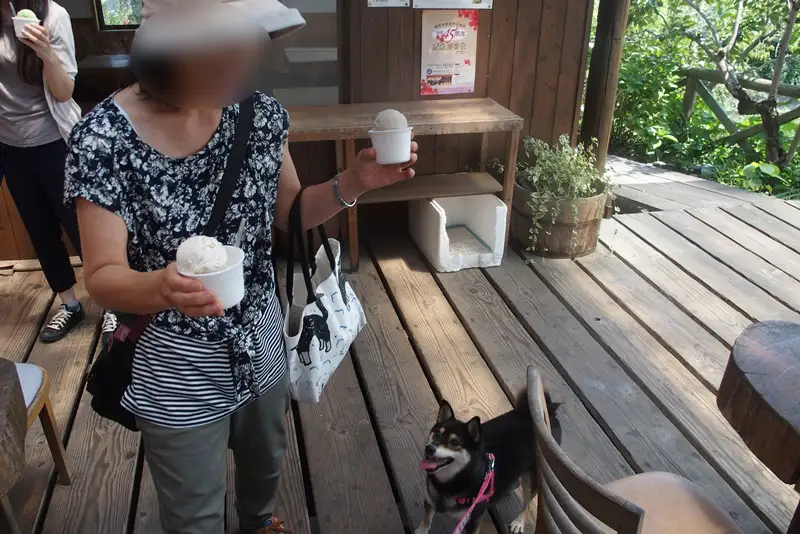 いや、おいしかった!わんこもテラス席はOKということで、すばらしい眺めを見ながら、ミルク味のバニラと、私は黒豆きなこのダブルをよばれました。