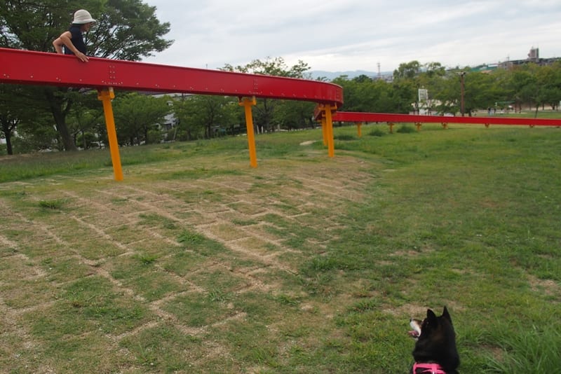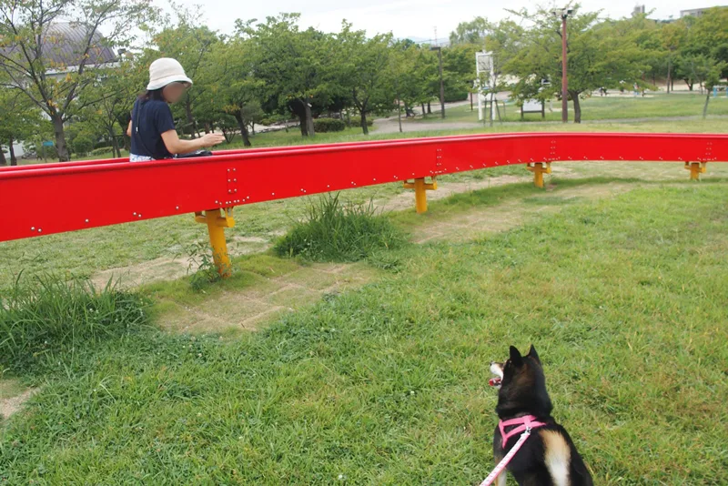あーちゃんも滑り台すべってたら、幼児が珍しがって、「わんわん、わんわん」って言って近づいてきました。