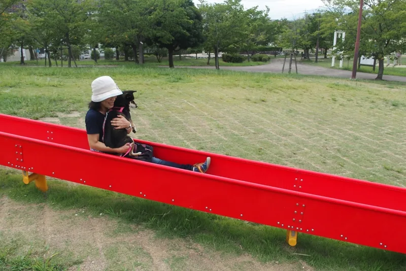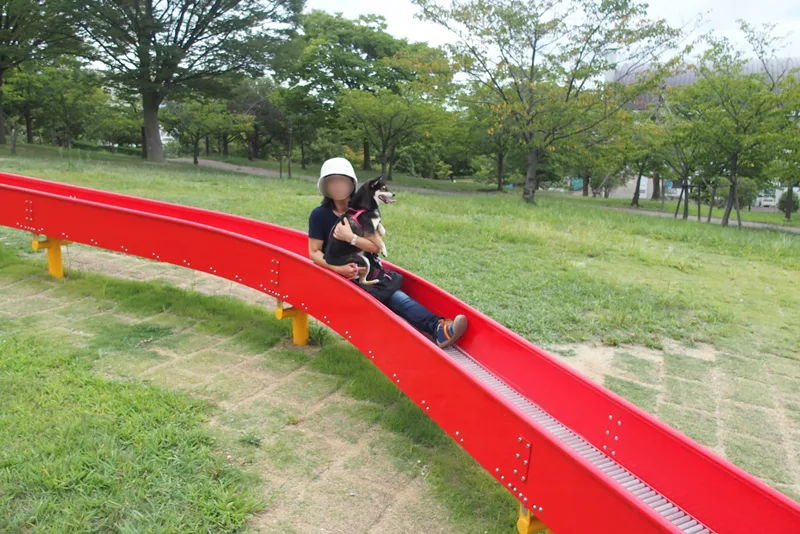 そりゃ、オバさんが犬抱いて滑り台滑ってたらめずらしいわな・・・・。