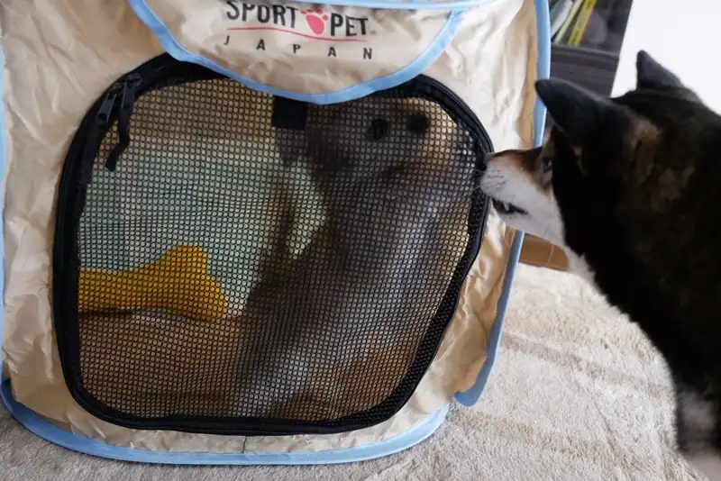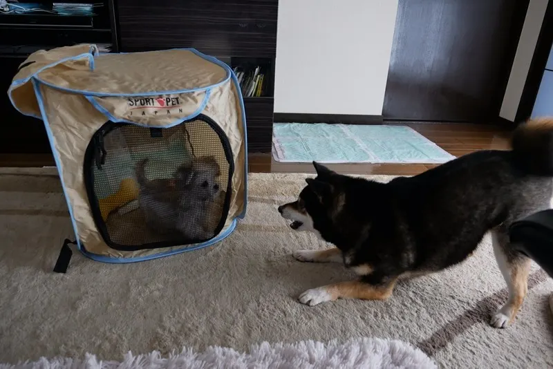 初日、やはりあーちゃんはかなりくーちゃんのことを威嚇して吠えたてて、『えー、どうなることか??』