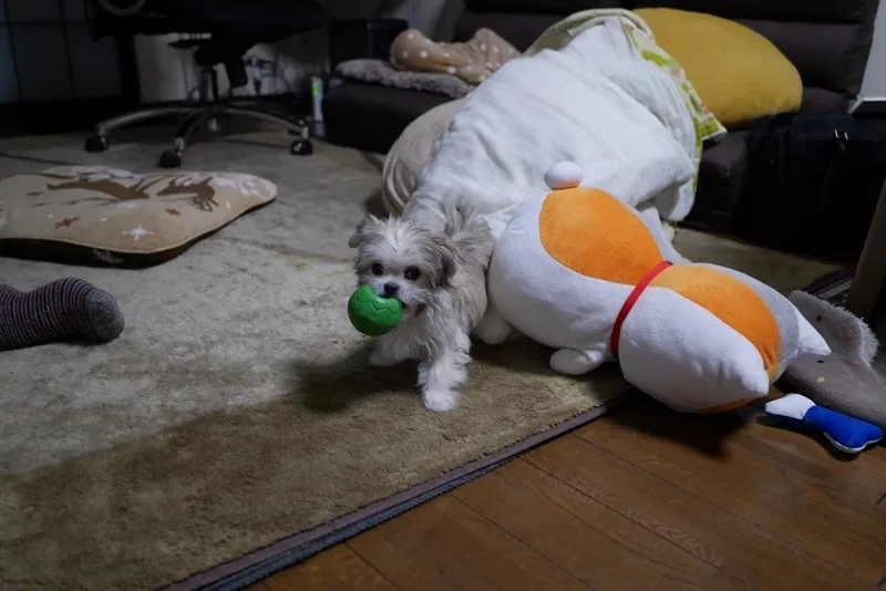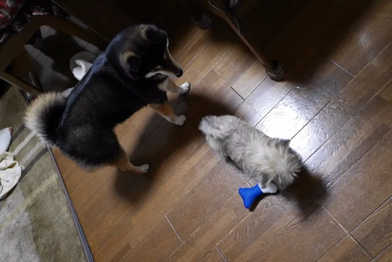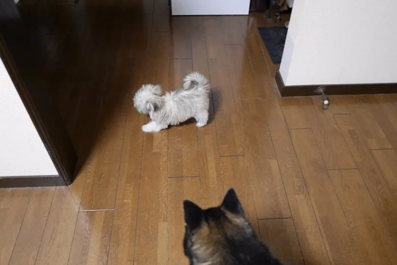 子犬があーちゃんにじゃれついて、あーちゃんが怒る?パターンなんですが、実はあーちゃんも子犬が気になって、お尻を追いかけてばかり。