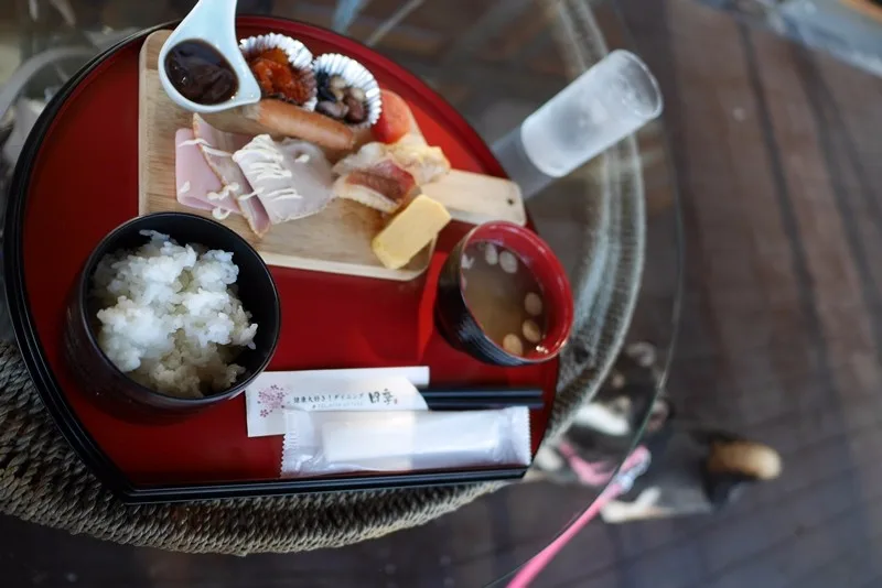 朝食は和洋取り入れたおしゃれなカットボードに盛り付けた定食。