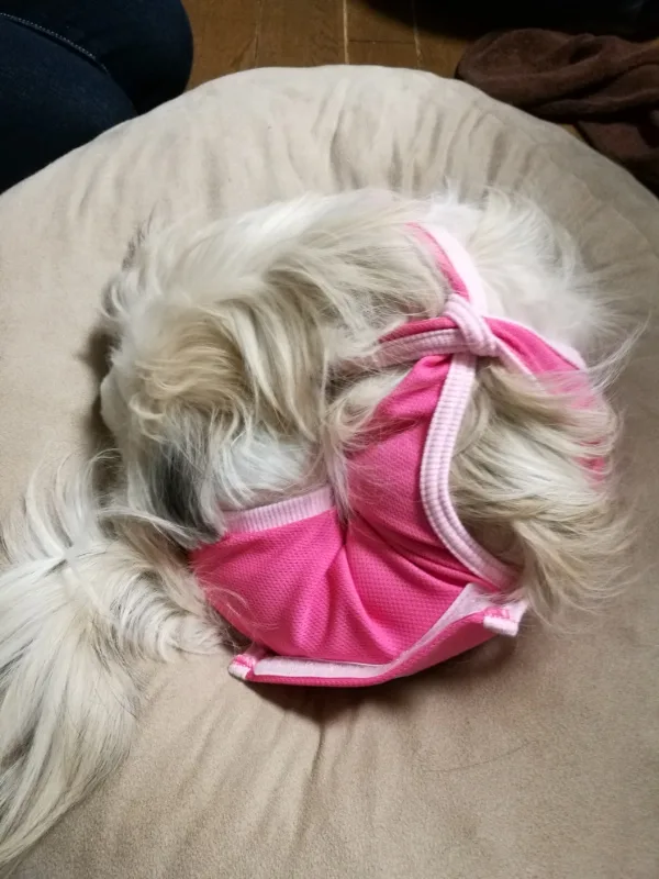 術後服はあらかじめネット購入していて、サイズはお店の人のアドバイスで「DSS」ダックスの小2を買いました。くるみはちょっと胴長なんです。