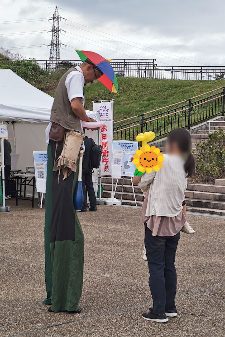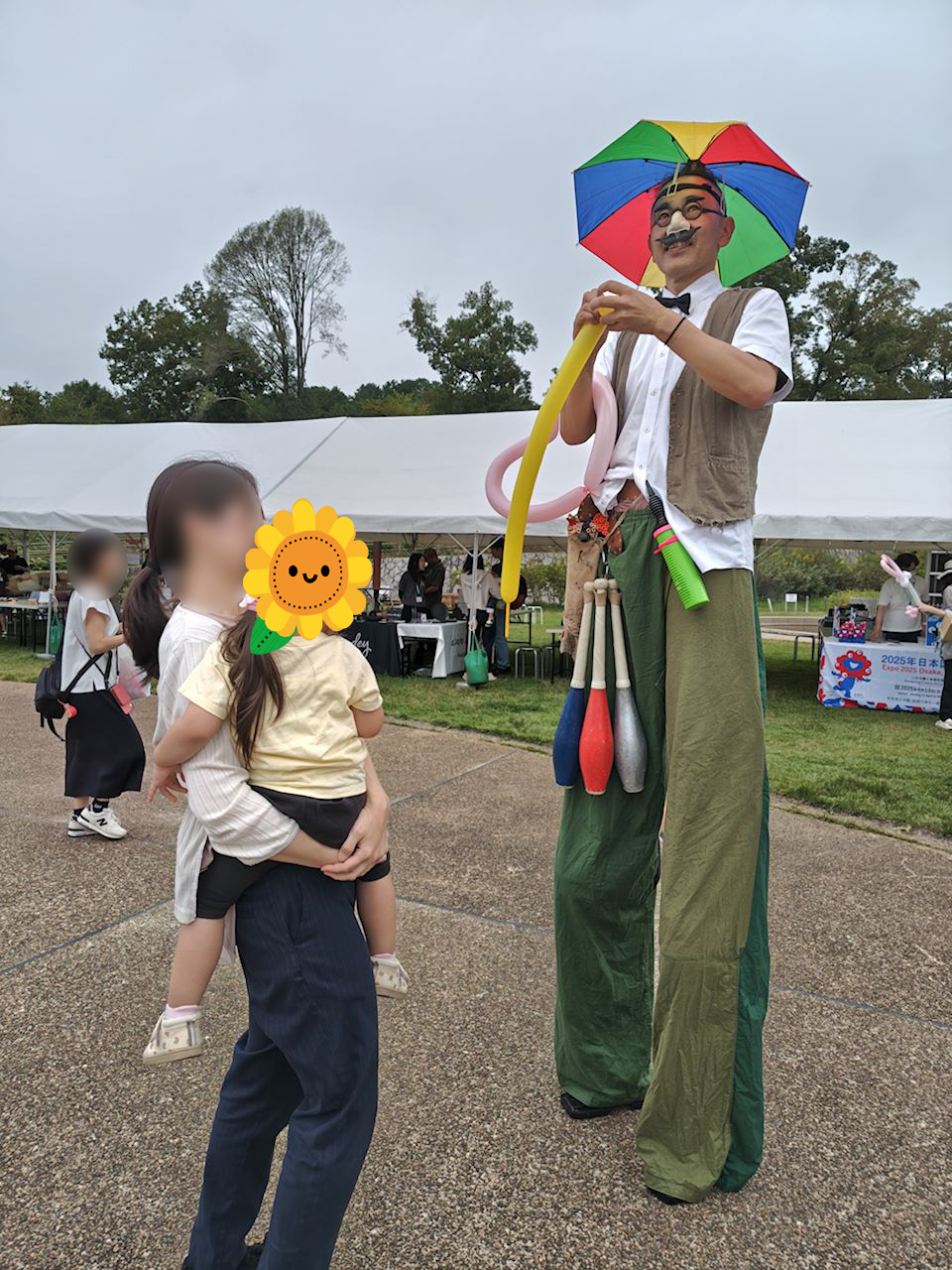 本当にたくさん遊んで楽しみました。特に大道芸のおじさんには無理言って、風船が割れて号泣する娘の風船を修復していただきました。おじさん、長時間、竹馬のような足場?の上で、お疲れのところありがとうございました。